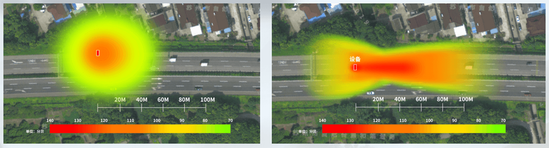 通過聲場對比圖可以看出,普通揚聲器的指向性較差,傳播距離較短。聲音侵入對向車道,語音無法精準播報,無法滿足高速路使用需求。清聽聲學高速公路定向喇叭既可以做到高聲壓級,遠距離傳播,同時還具有較強的指向性,滿足精準播報的需求。